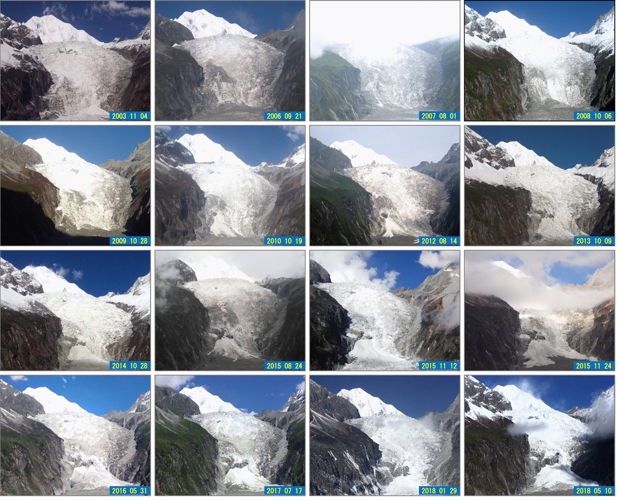 “最近10年,贡嘎山冰川消融明显加速。”刘巧2003年进入贡嘎山站,开展冰川研究,从那时起,他习惯每年给冰川拍一张照片,他的记录中,海螺沟冰川正在以肉眼可见的速度后退减薄,这是贡嘎山地区气候变化的最直接证据。