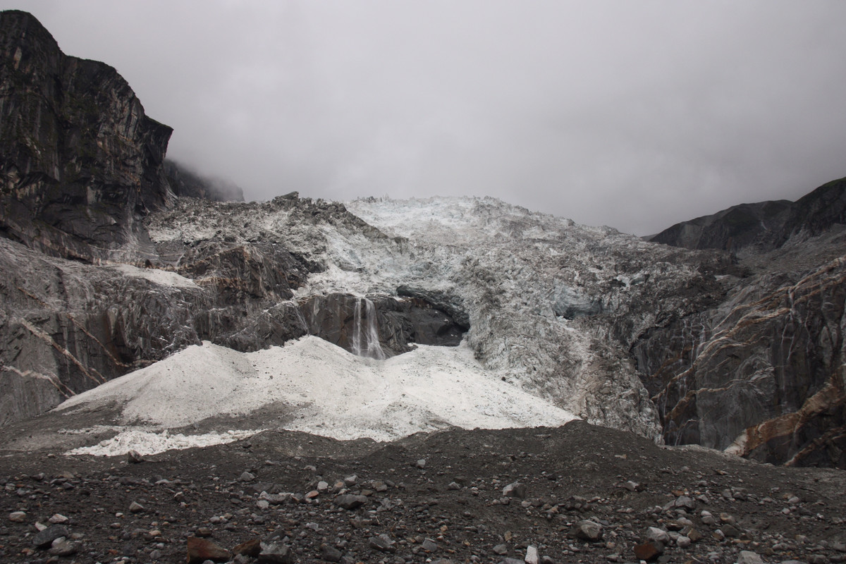 过去百余年时间里,海螺沟冰川形成了一个长约2000米,宽约200米,垂直高差不过100米左右的冰川退缩迹地,起点在现在海螺沟景区金山饭店附近观光车游客下车点,终点就在目前的冰川末端边缘。