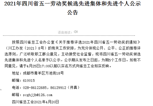 4月20日记者获悉,按照四川省总工会办公室《关于推荐评选2021年四川省五一劳动奖的通知》的有关工作安排,为充分体现公开、公平、公正的推荐评选原则,广泛听取职工群众意见,主动接受社会监督,现将四川省五一劳动奖候选先进集体和先进个人名单予以公示。公示期从发布之日起,为期5个工作日。如有不同意见,请于4月25日17:00以前以实名方式向省总工会如实反映。
