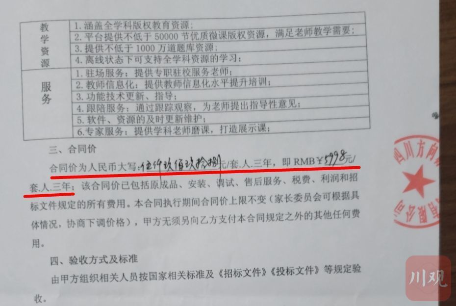 无论是睿易公司的平板电脑还是“优学派”平板电脑,都是由一家叫做“四川方向标教育咨询有限公司”的公司统一采购后,再转卖给学生。该公司与柳树中学签署了智慧课堂建设准入协议,协议里标明合同价为5998元/套、人、三年,“学生家长自愿购买该产品和服务后,由学生家长直接向乙方(即公司)支付”