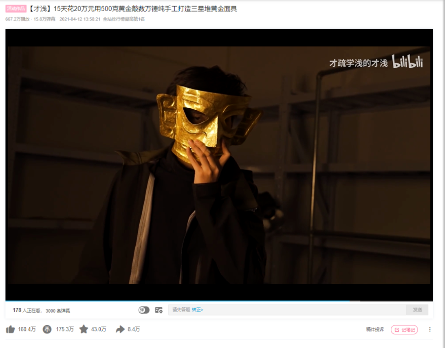 此前,B站视频博主“才疏学浅的才浅”(以下简称“才浅”),用500g黄金DIY三星堆新出土的黄金面具的视频在网上传播开来,引发众多关注。