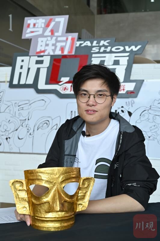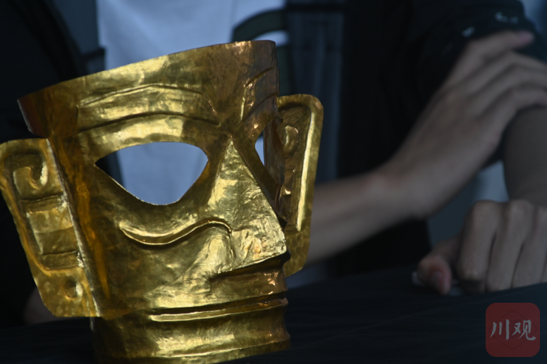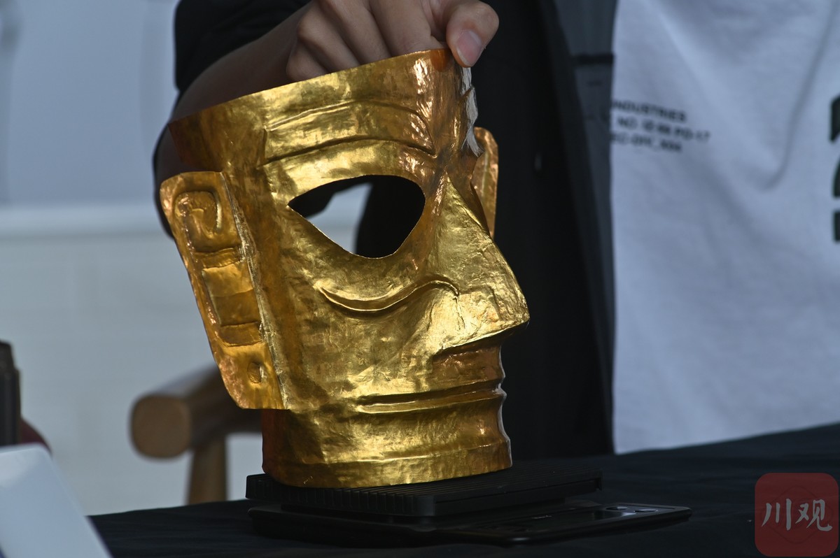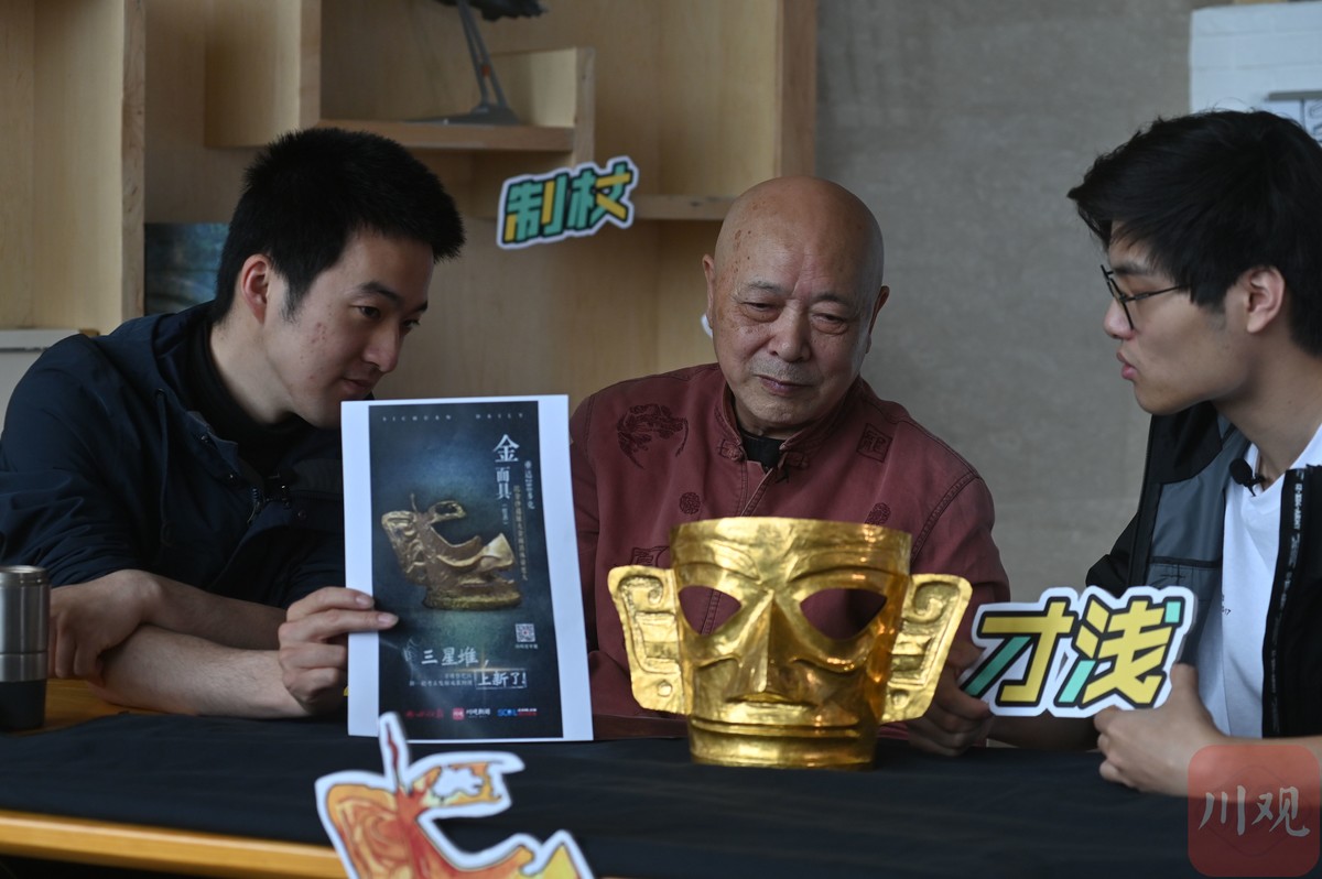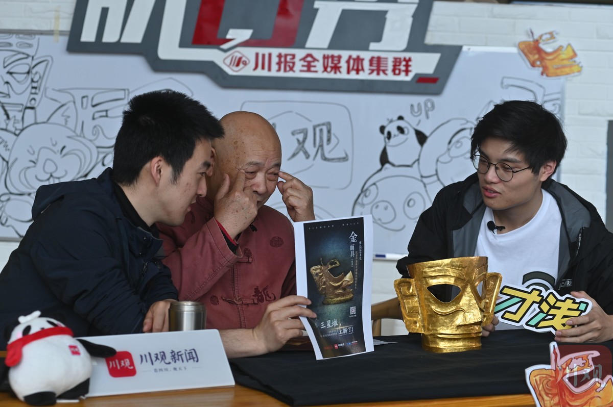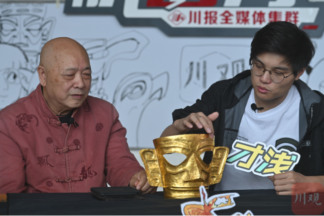 4月20日,才浅带着他制作的黄金面具,千里迢迢来到四川,在四川日报·川观新闻大楼里,拜访三星堆文物修复大师杨晓邬,现场学艺传教。