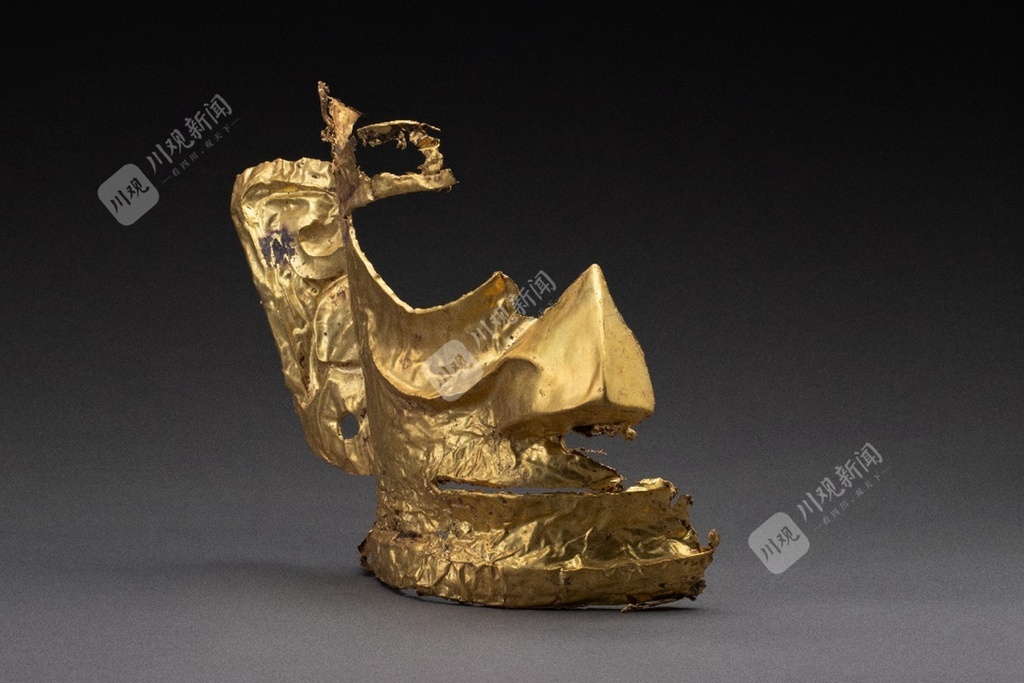 杨晓邬解释,还有整个面具的弯曲的弧度,也与文物不符,三星堆出土的黄金面具应该是覆盖在青铜面罩上的,所以弯曲的弧度比较深一些。