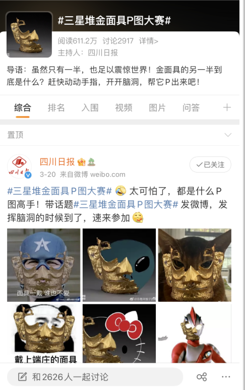 3月20日,三星堆新发现的黄金面具引发关注后,才浅也大受触动。当时,四川日报·川观新闻在网络上发起了黄金面具P图大赛,引发了众多“油菜花”网友的参与热情,纷纷为面具残缺的部分进行补位。