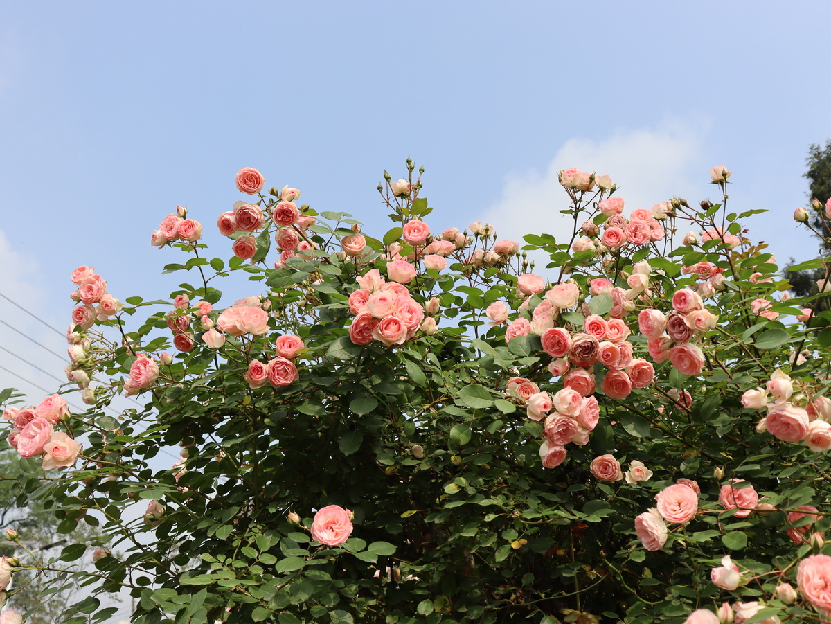 4月21日,记者从五彩牛桥·玫瑰花坞的入口进入园区,道路两侧粉色的海瑟姆玫瑰爬墙而生,缠绕在花架上摇曳生姿,借微风摇晃着脑袋,各色玫瑰花竞相开放,让前来观赏的游客大饱眼福,也让当地群众以花为媒,增加了经济收入。