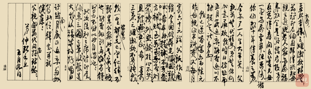 前访印尼、缅甸归得讯知母亲去世。她老人家亦属福寿双全,是好结局,故弟反觉得春间返蓉见母一面已属幸事,但更感谢你们数十年侍养之劳,今亦了一人生大事矣。父亲前望待请安,更望你们加意承欢。我明日访越南五月底返京,能否返川不能预定,请勿念。