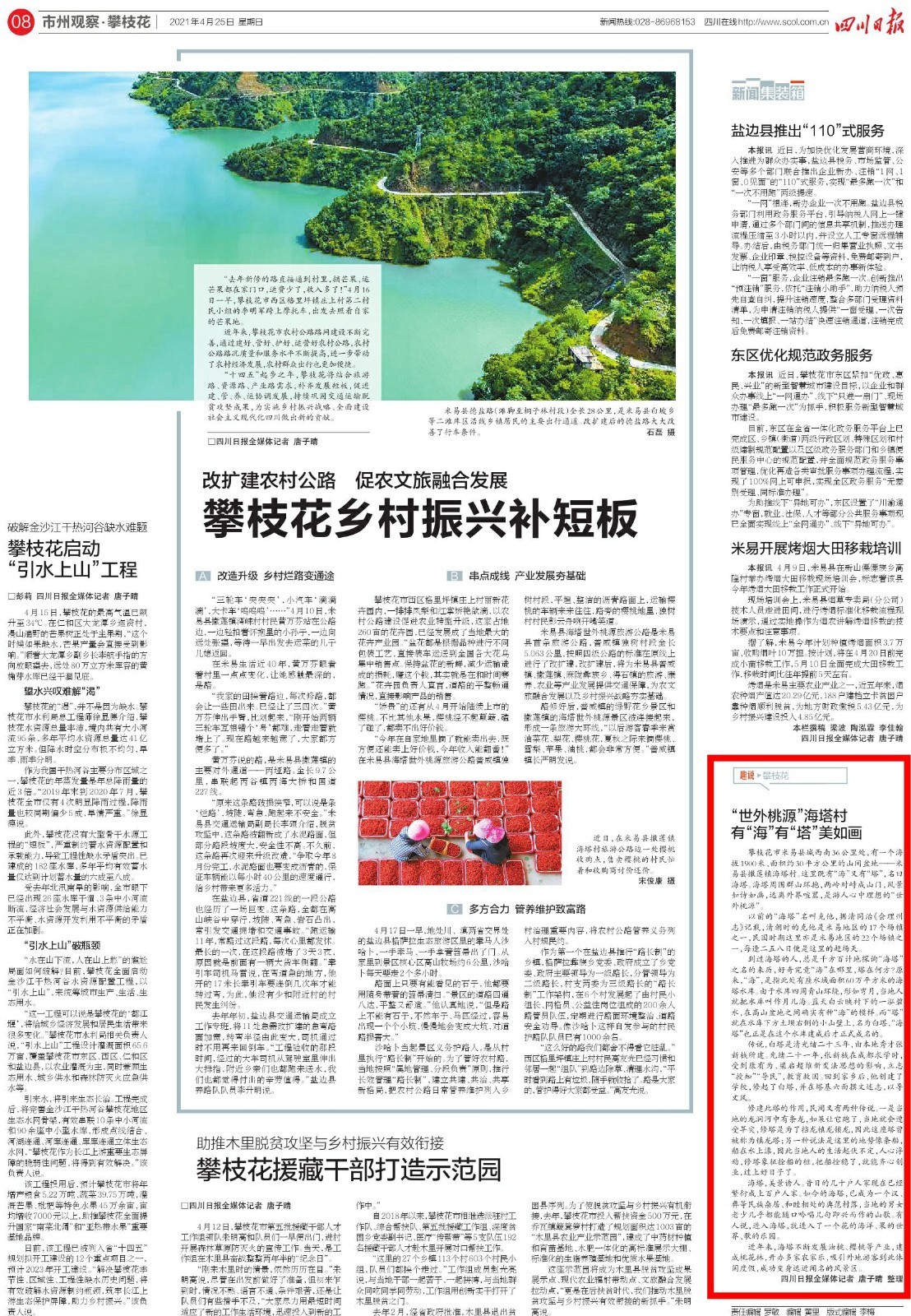 攀枝花市米易县城西南36公里处,有一个海拔1900米、面积约30平方公里的山间盆地——米易县撒莲镇海塔村。这里既有“海”又有“塔”,名曰海塔。海塔周围群山环抱,两岭对峙成山门,风景如诗如画,远离外界喧嚣,是游人心中理想的“世外桃源”。