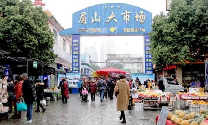 眉山大市场地处眉山市主城区新区彭寿街151号,占地62.14亩,建筑面积18000平方米,2000年9月正式投入使用,分为A、B、C、D四个区,集轻工业品、农副产品、生活日用品销售于一体,目前有个体工商户168户,年均交易额约4.8亿元,已成为周边近6万居民的“菜篮子”。