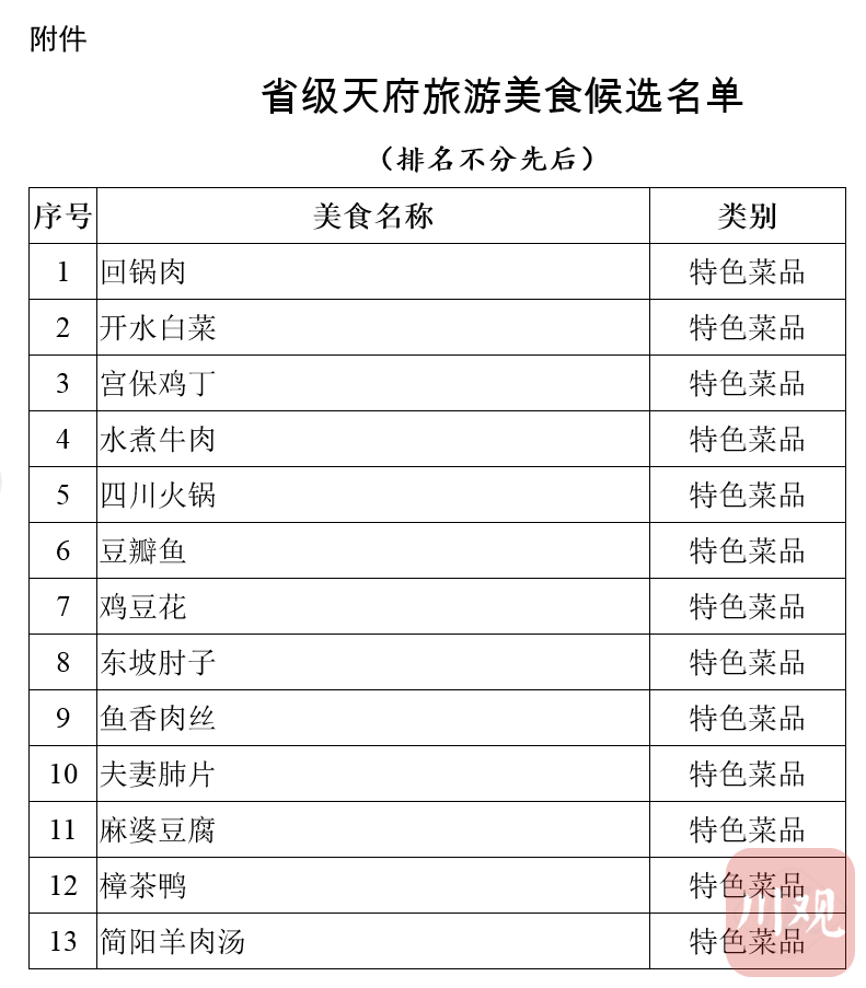 为广泛听取社会各界意见,接受公众监督,现将省级天府旅游美食候选名单予以公示,如有异议,请实名书面反馈至文化和旅游厅非物质文化遗产处。