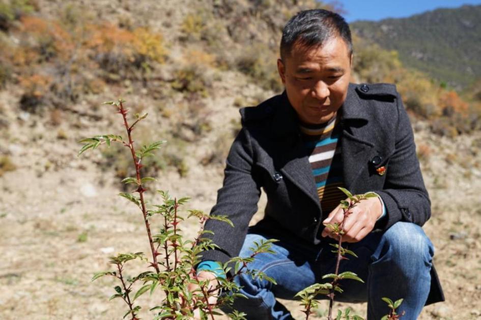 赵登全查看花椒苗生长情况
