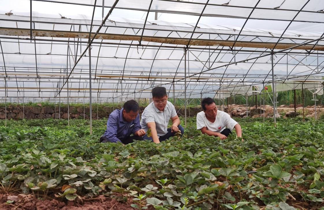 李四方(中)在草莓园中指导村民进行田间管理。(受访者供图)