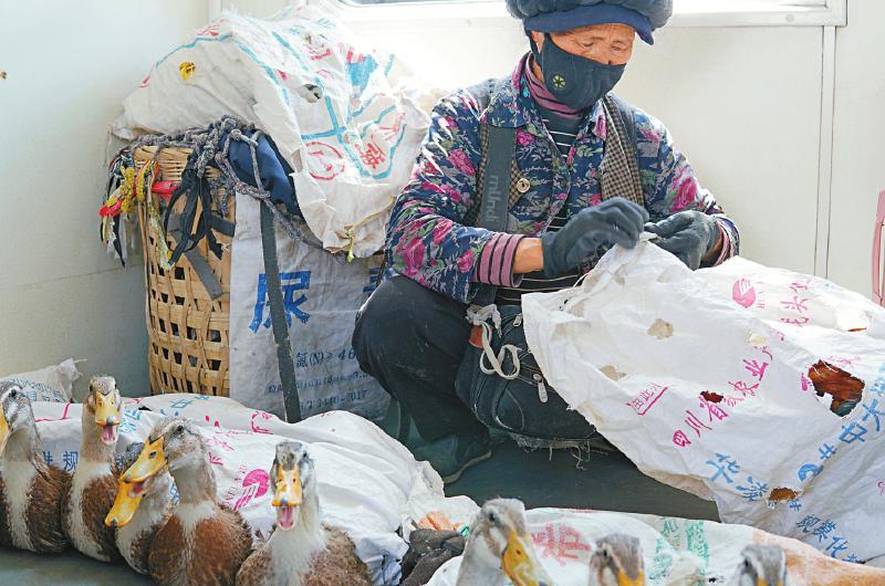 4月23日,5634次列车上,一位彝族阿妈带着自家的鸭子上车,在大件行李处缝制装鸭子的袋子。 陈姝妤 摄