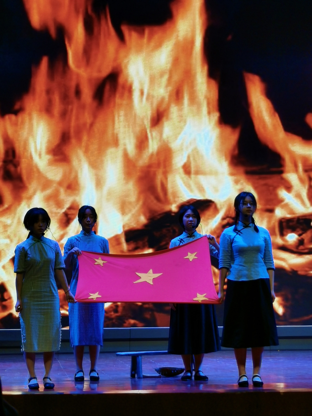 “这是我们的旗帜,它终将在这块土地上高高飘扬,这是我们的旗帜,它将带领我们向前。”当欧雅巍含泪讲出这段台词时,台下也隐隐有啜泣的声音。这是石室中学高二2班同学的话剧作品《红岩》的演出现场。