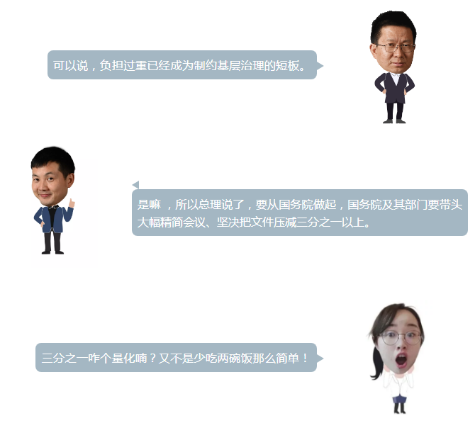 3月5日上午,国务院总理李克强作政府工作报告时提出:“让干部从文山会海、迎评迎检、材料报表中解脱出来,把精力用在解决实际问题上。压减和规范督查检查考核事项,实施“互联网+督查”。减少开会和发文数量,今年国务院及其部门要带头大幅精简会议、坚决把文件压减三分之一以上。”