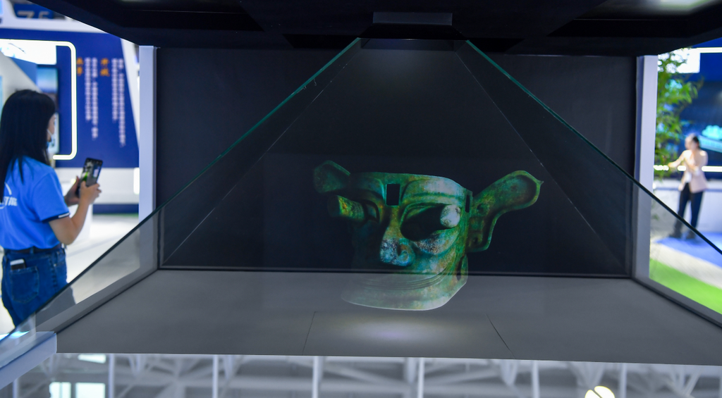 4月25日在福州开幕的第四届数字中国建设峰会上,作为主宾省的四川展区内,三星堆的代表文物铜纵目面具“亲临”现场,引来现场观众啧啧赞叹。通过数字采集后再全息投影的文物,参观者可以360近距离观察全貌,感受三星堆文化的魅力,文物“活起来”了。