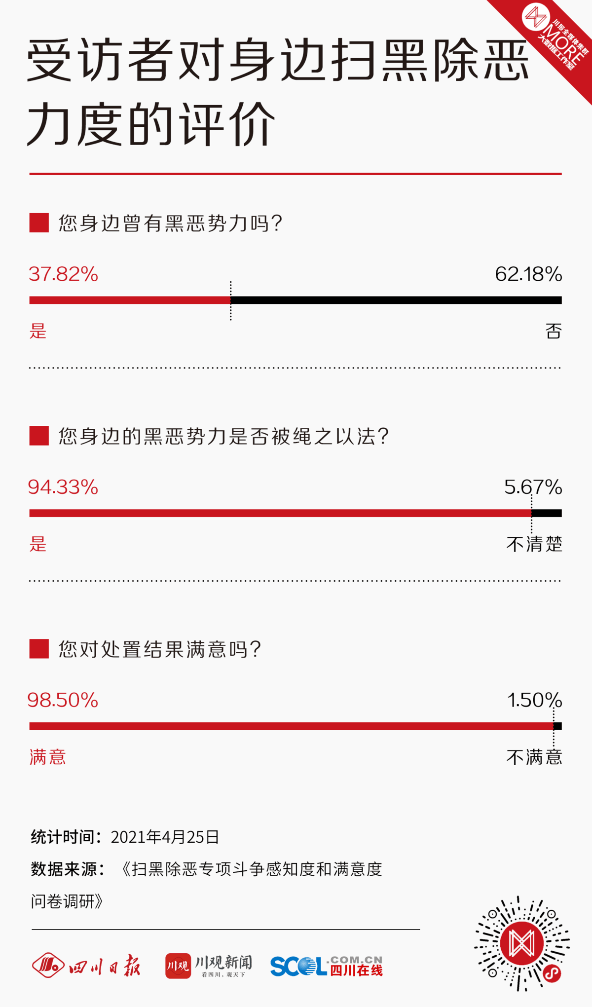 有37.82%的网友身边出现过黑恶势力,并有94.33%的网友表示身边的黑恶势力被绳之以法,98.5%的网友对处置结果表示满意。