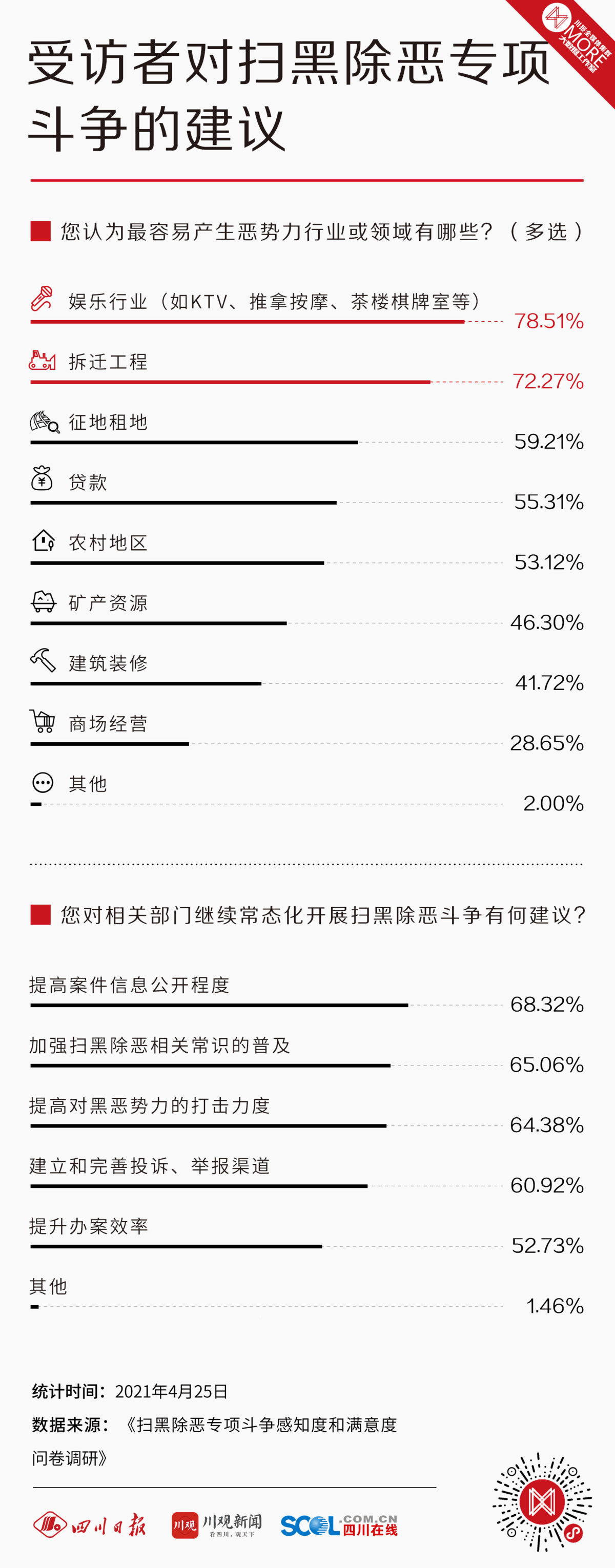 问卷数据显示,娱乐行业和拆迁工程成为民众心目中滋生黑恶势力的“温床”,分别占比78.51%和72.27%,需进一步加强监管。