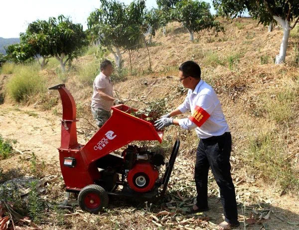 4月28日下午,攀枝花市西区格里坪镇金桥村9组干箐梁子的芒果林里,村民张贵银和熊顺华正忙着往粉碎机里投放干枯树枝进行粉碎。