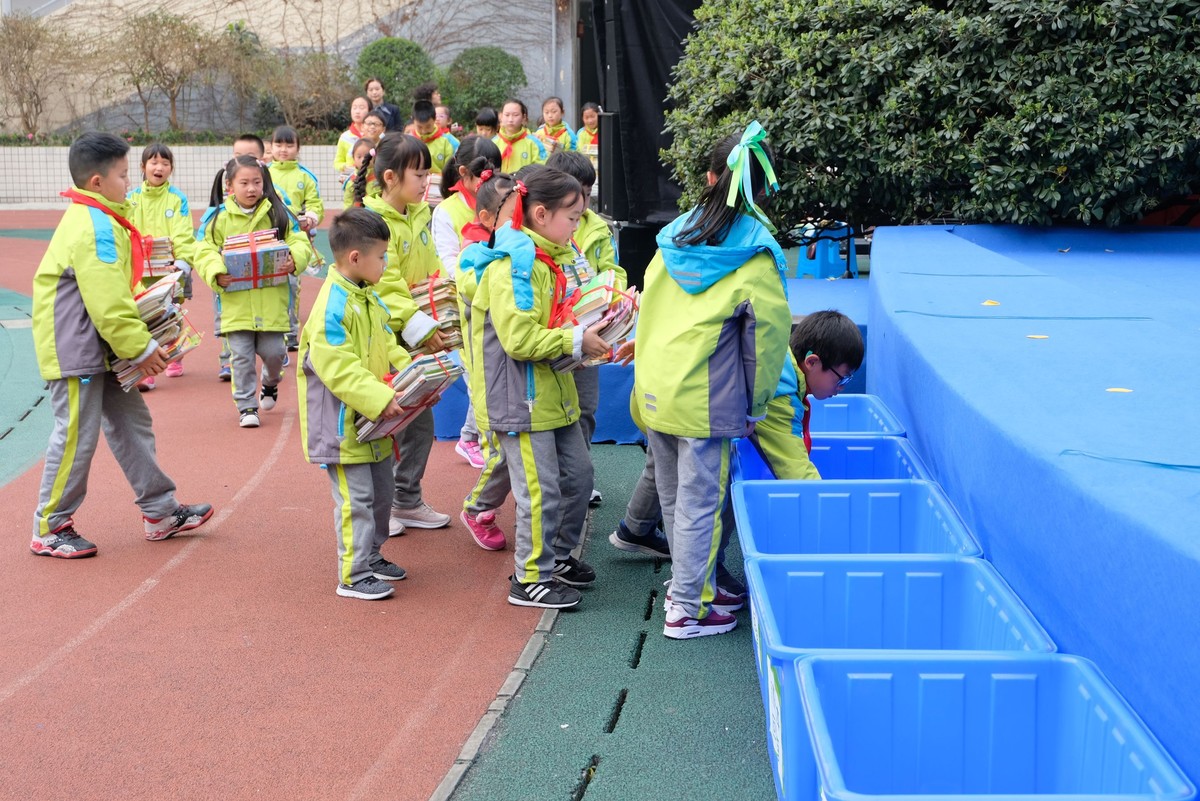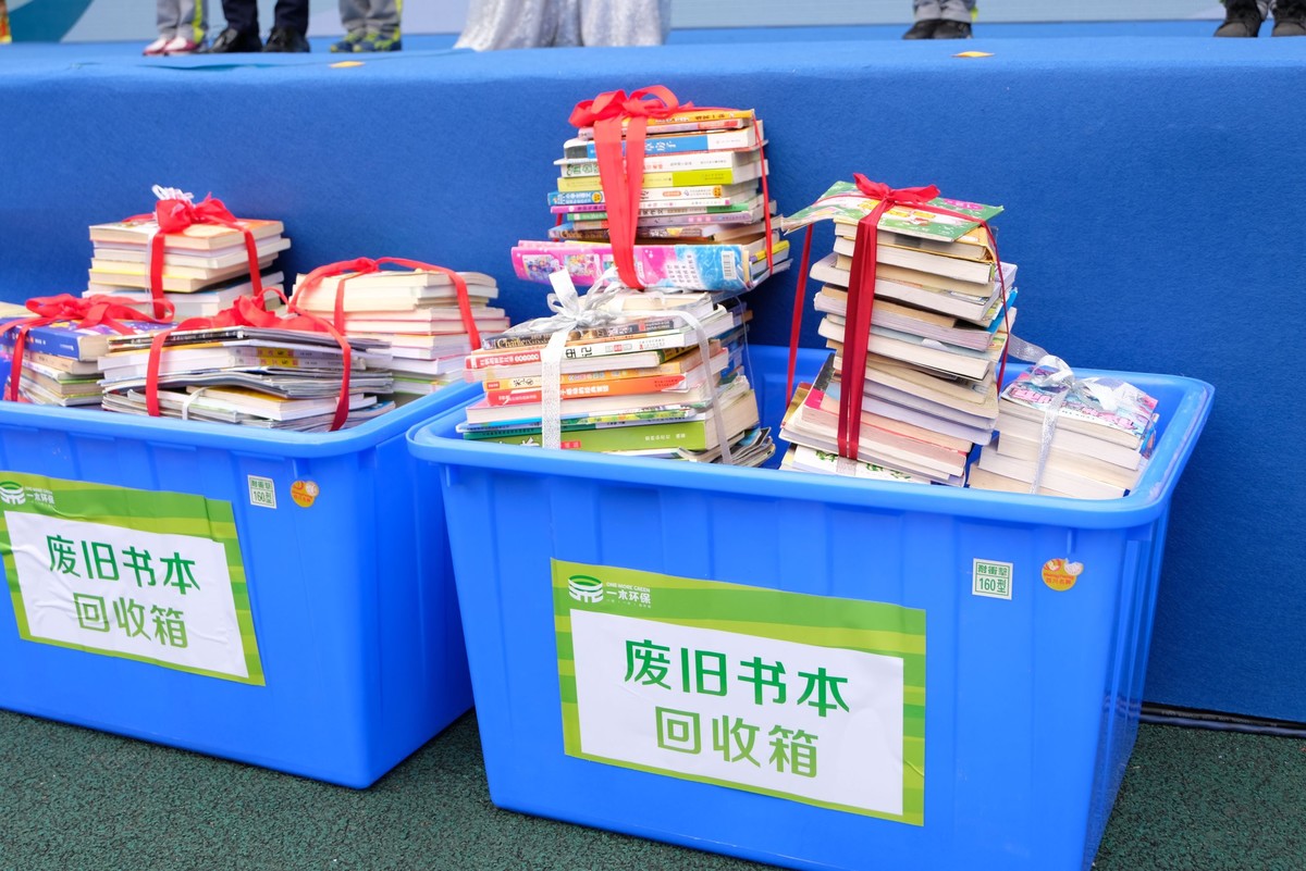 启动仪式上,少城小学的孩子们身着绿色校服,朝气蓬勃,与环保主题相当契合。孩子们踊跃地将自己的废旧图书放进一个个回收箱中,并集体宣读了环保倡议书,承诺要爱护环境、变废为宝、不浪费要节约,珍惜手中的一纸一书。