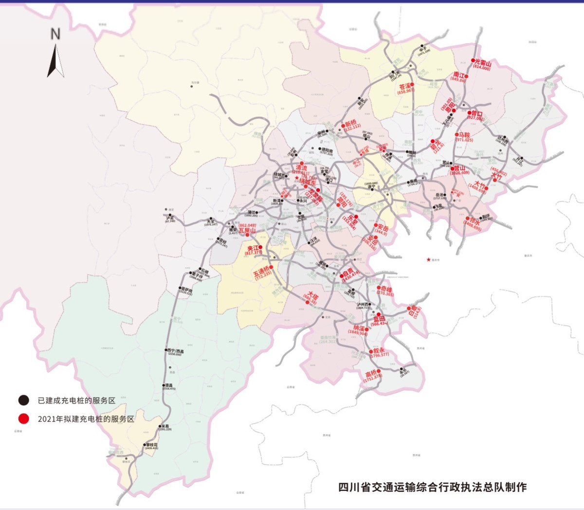 优先保障成渝双城经济圈,2021年,规划在17条高速公路段34对高速公路服务区建成66处充电桩,其中成渝主线、川渝支线21对服务区,确保成渝两地电动汽车出行高速公路无障碍。