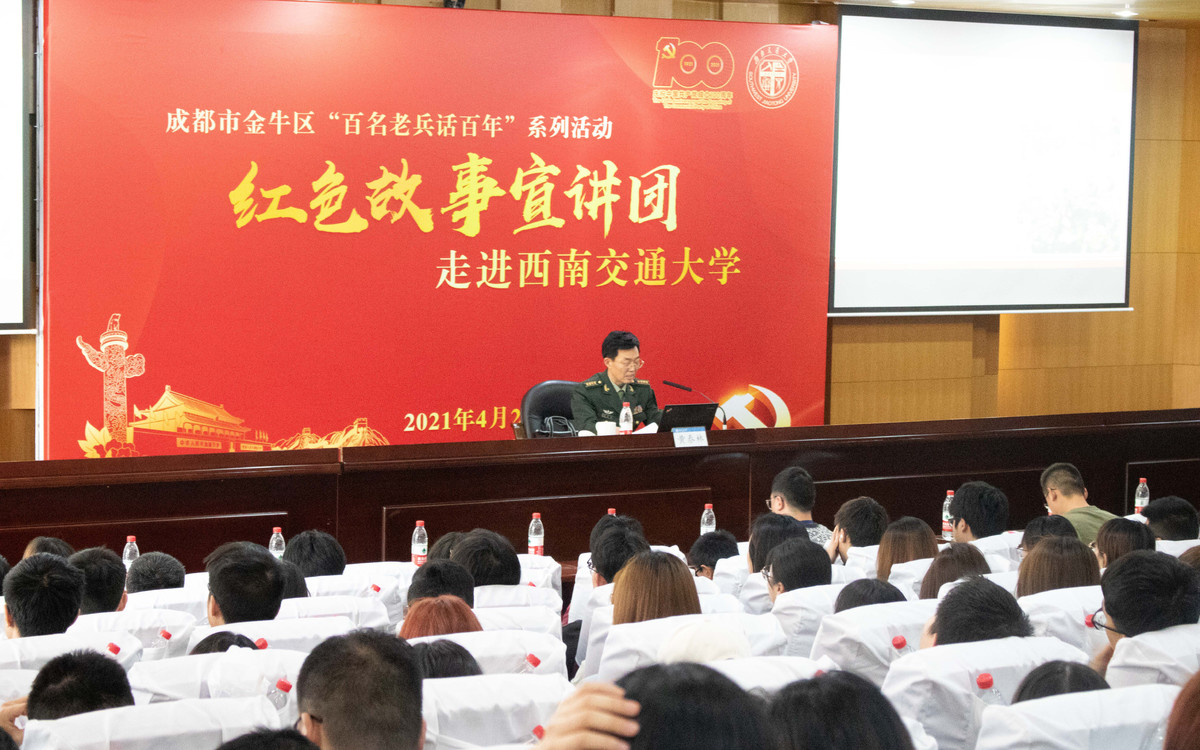 4月28日,金牛区军队离退休干部“红色故事宣讲团”走进西南交通大学,为在校师生开展党史学习教育。活动在西南交通大学犀浦校区二号报告厅举行,学校成都校区各学院师生代表、“三新班”骨干成员、国旗班学生约400人到场聆听。