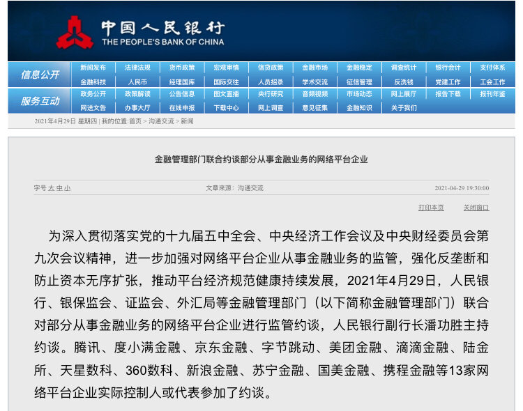 记者从央行官网获悉,2021年4月29日,人民银行、银保监会等金融管理部门(以下简称金融管理部门)联合对部分从事金融业务的网络平台企业进行监管约谈。其中,腾讯、度小满金融、京东金融、字节跳动、美团金融、滴滴金融、陆金所、天星数科、360数科、新浪金融、苏宁金融、国美金融、携程金融等13家网络平台企业实际控制人或代表参加了约谈。