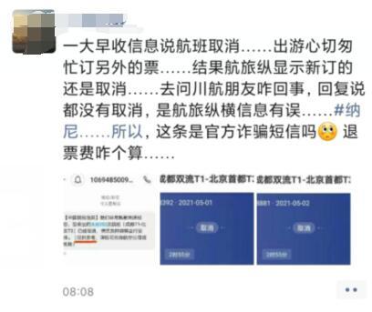 “二氧化碳”立即重新购买了5月2日出发前往北京的机票,却又收到取消通知。她感觉到不对劲,电话咨询川航客服热线,却被告知她先后两次购买的航班均未取消。