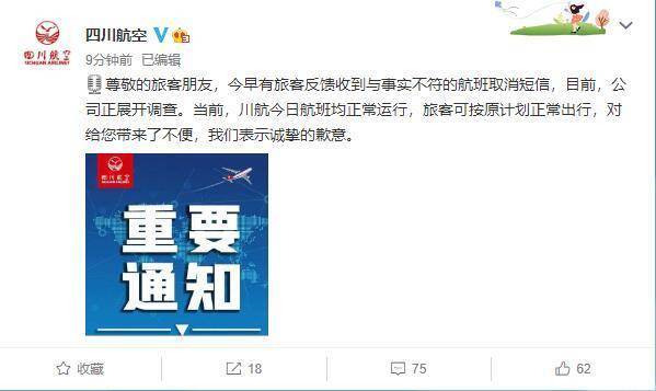尊敬的旅客朋友,今早有旅客反馈收到与事实不符的航班取消短信,目前,公司正展开调查。当前,川航今日航班均正常运行,旅客可按原计划正常出行,对给您带来了不便,我们表示诚挚的歉意。