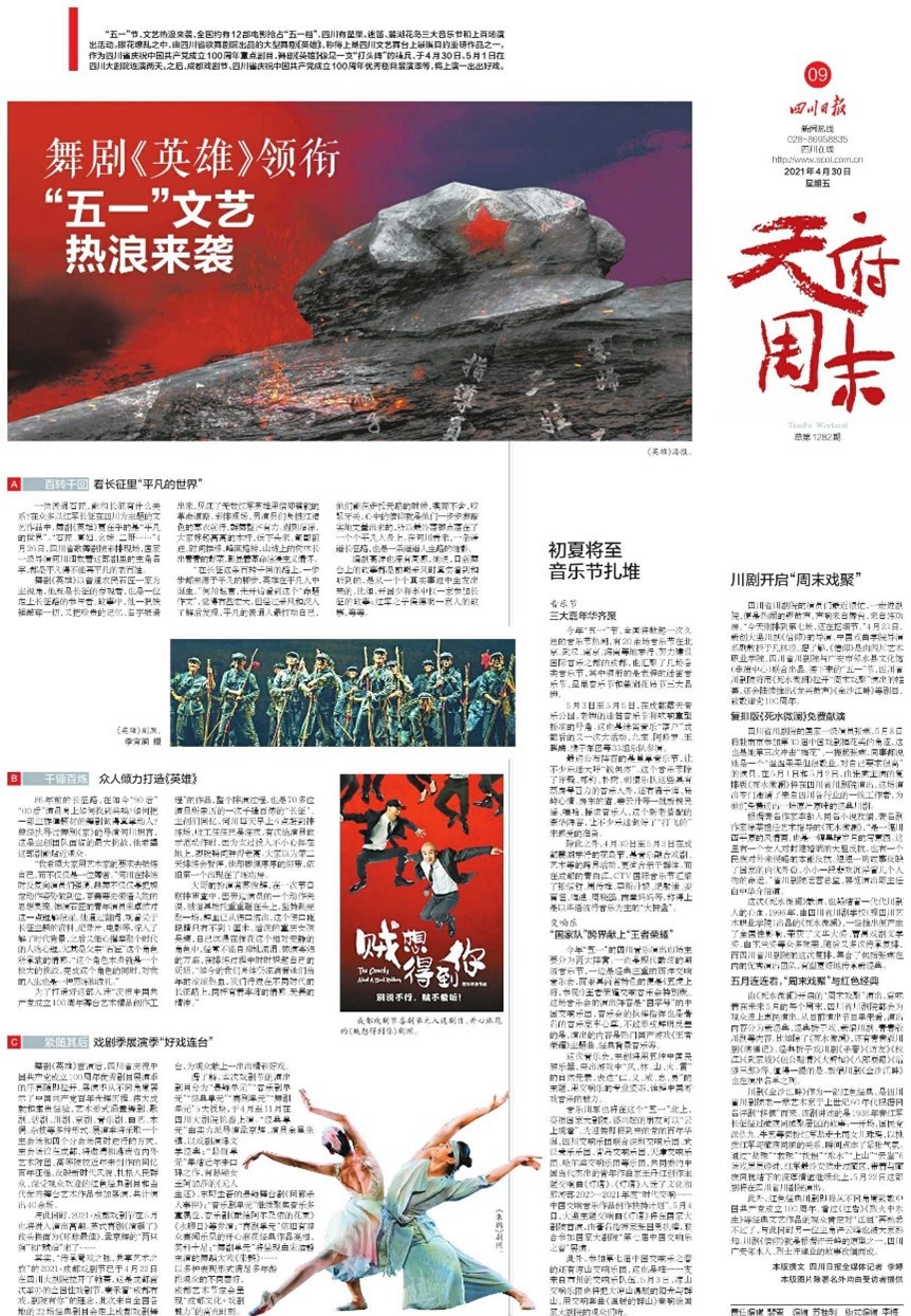 今天的四川日报也以《天府周末》整版形式,为大家“剧透”了《英雄》和文艺演出的情况!