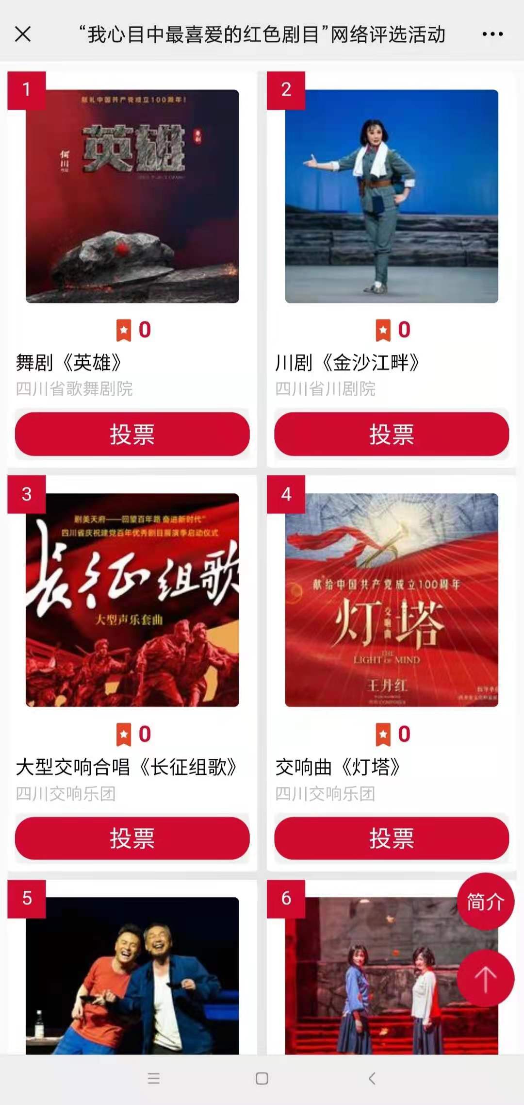 与此同时,由中共四川省委宣传部、四川省文化和旅游厅、四川省文学艺术界联合会指导,四川省锦城艺术宫支持,四川日报报业集团、四川省演出娱乐行业协会联合发起——“我心目中最喜爱的红色剧目”网络评选活动,目前平台投票通道已开启!