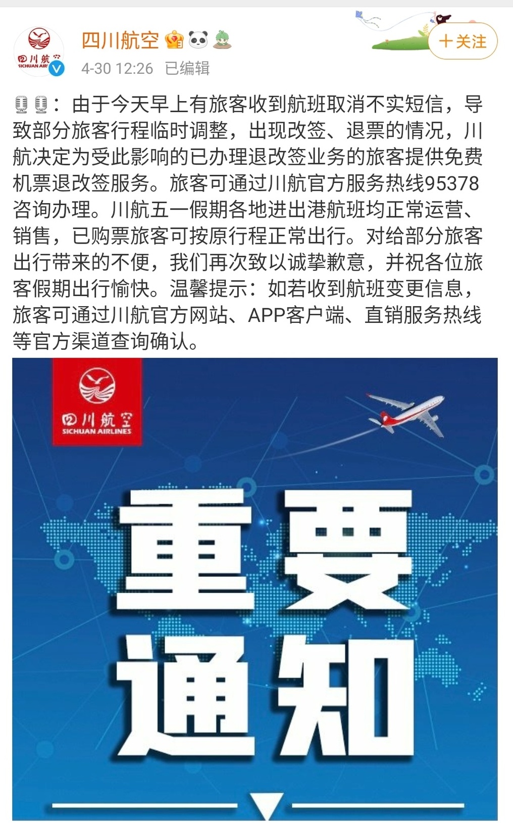 4月30日中午,四川航空官方微博就“航班取消不实短信”事件发布最新回应: