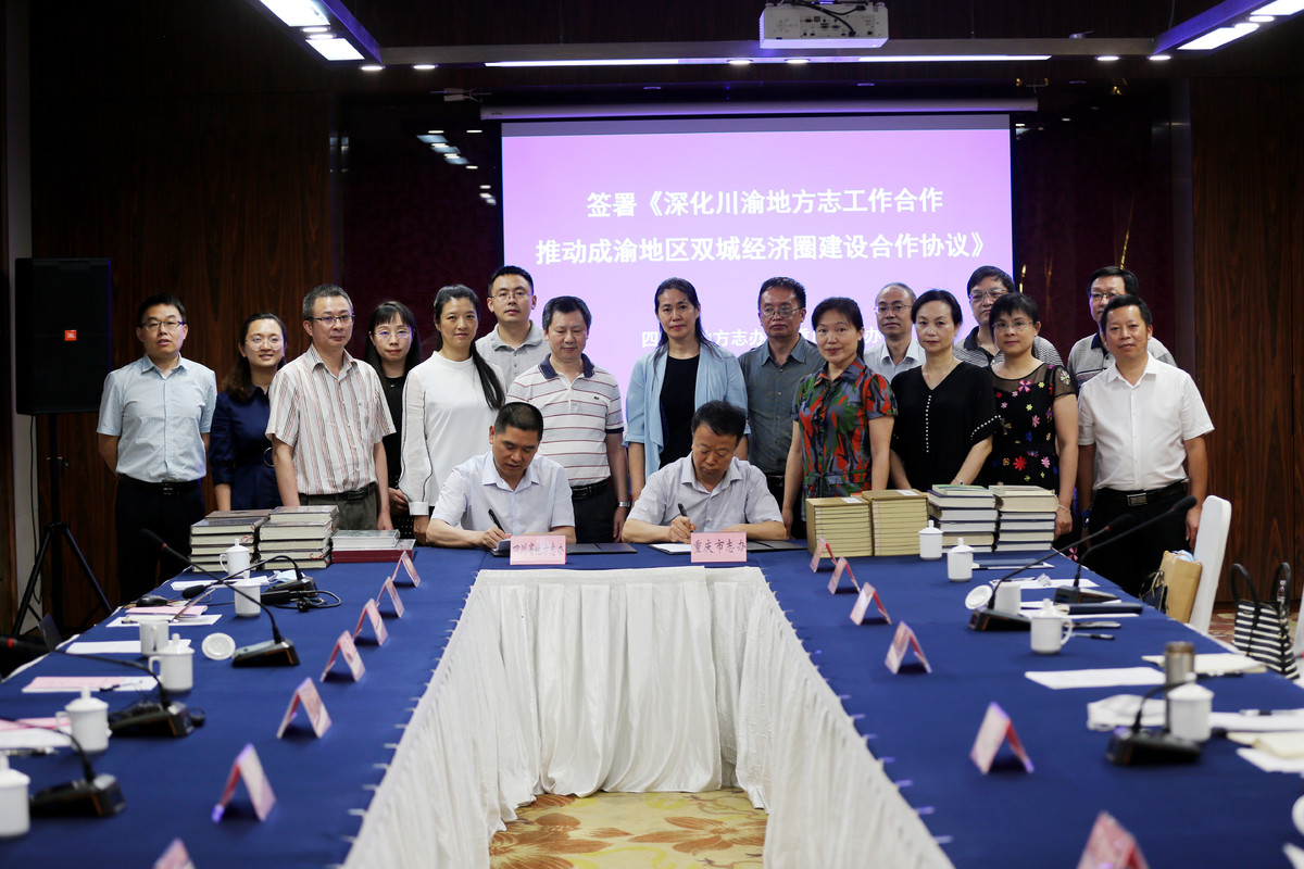 根据《关于印发〈深化四川重庆合作推动成渝地区双城经济圈建设工作方案〉的通知》要求,2020年6月19日,四川省地方志办、重庆市地方志办(以下简称两省市地方志办)在重庆签署《深化川渝地方志工作合作 推动成渝地区双城经济圈建设合作协议》,明确两省市地方志办将统筹地方志资源,从山水相连、历史同脉、文化同源、人文相通等方面加强成渝地区共同文化基因的挖掘、共同人文精神的提炼、共同文化认同的塑造,探索联合编纂出版《成渝地区双城经济圈建设年鉴》等一系列志鉴和地情书籍。