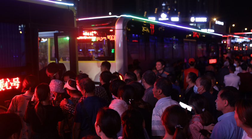 当晚上8时许,伴随着优美的萨克斯音乐,在面积约7000平方米,相当于19块标准IMAX电影屏幕的天幕上,播放了130路公交车特色主题视频,130路公交司机纷纷闪亮登场,向现场观众展示了礼仪及才艺表演,十分吸睛。