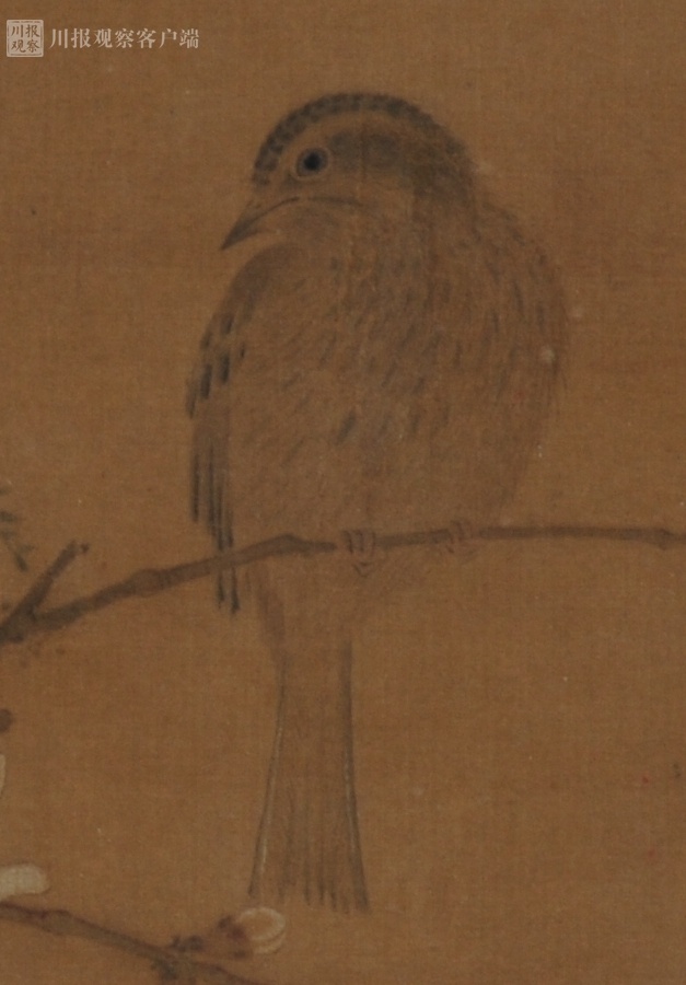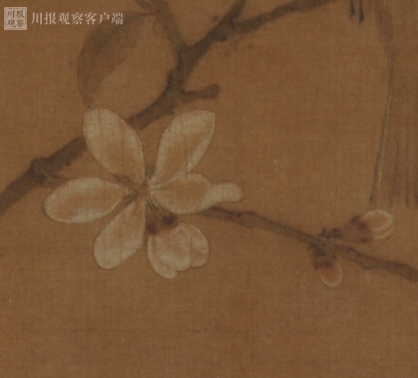 画中梅枝的画法,则是花开一两朵再配上几点花苞,带着疏寂的诗意境界。此外,宋徽宗还以生漆给山雀点睛,生漆高出绢素的立体质感,让山雀“几欲活动”。