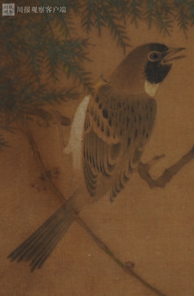 彭代群说,这幅扇面为绢本,色泽黄润。最吸引眼球的是,宋徽宗把宋代花鸟画中“格物”的追求发挥到了极致,将立于腊梅之上的双禽刻画得栩栩如生。即使近千年过去,仍能看出双禽为中国特有的黄腹山雀,是山雀家庭中少有的双栖双飞的“夫妻鸟”。山雀用淡彩层层晕染,再以尖毫细笔绘出绒羽,笔触精细,刻画准确,富有毛绒的质感。