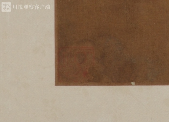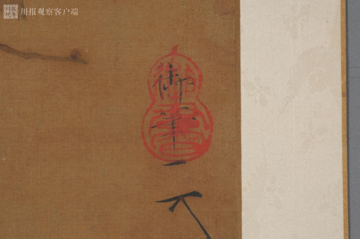 在扇面右下角,可见一个葫芦形的篆文“御书”章,上书“御笔”和花押款。彭代群说,宋徽宗花押风格特异,像一个“天”字。但是这“天”字的第一笔又和下面的有一段距离。通常认为是“天下一人”的略笔。