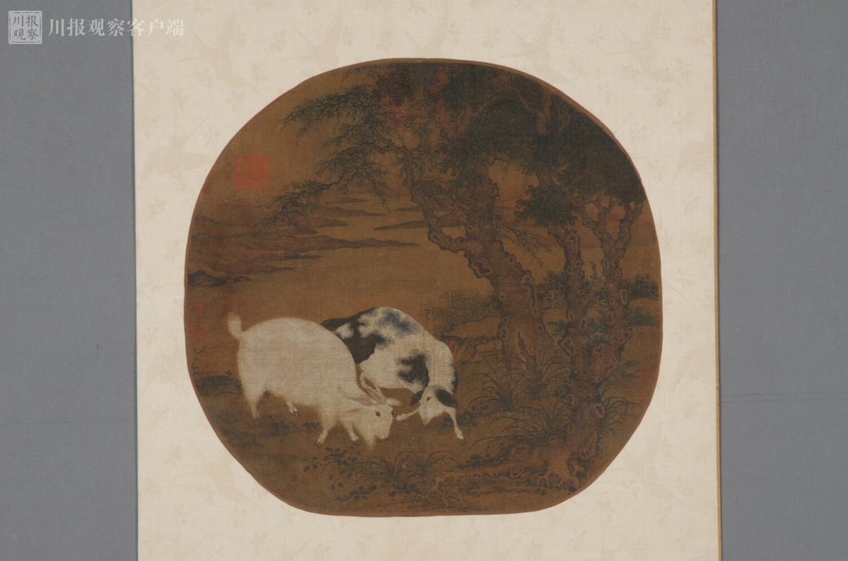元人林原双羊图纨扇面