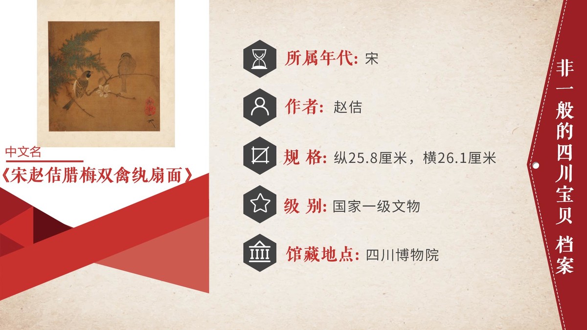 在四川博物院,馆藏着一幅宋徽宗的真迹----《腊梅双禽》纨扇面。这是一幅精致传神、笔墨技巧臻于完美的画作,在让观者击节赞赏之外,不得不感叹宋徽宗作为国君昏聩腐朽,但是作为艺术家却堪称天才。