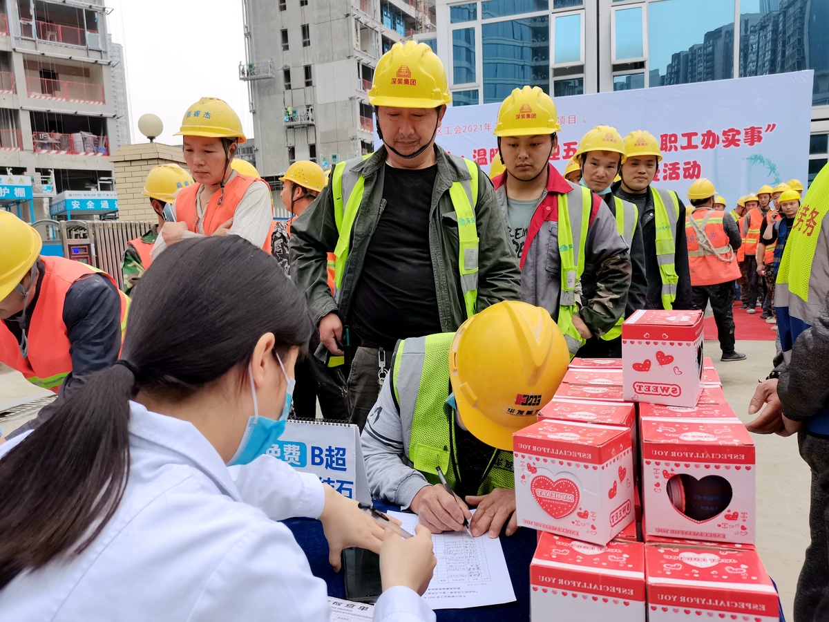 “为农民工办实事健康关怀进工地”活动在华发林家坡项目部工地开展,为工地农民工朋友设立免费体检服务,开展健康咨询、结石病检查、B超检查、医疗咨询等服务,让农民工感受工会的温暖。
