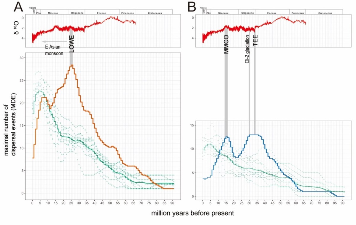 姜德纯介绍这和气候环境变化有很强的相关性:约6500万年前,白令陆桥区域温暖潮湿,两侧大陆间的扩散事件都在逐渐增多;约3500万年前,发生了一次冰期降温事件,欧亚大陆物种通过白令陆桥向美洲大陆的扩散还在增加,但增速明显减缓,而反向的扩散则出现减少。“可能是因为因为两个大陆在这一时期的动植物类群不一样。” 课题组相关人员表示,随后又出现过气候回暖,以及约2500万年前降温事件,这一切造成两大陆之间存在不对称量级的生物扩散现象。