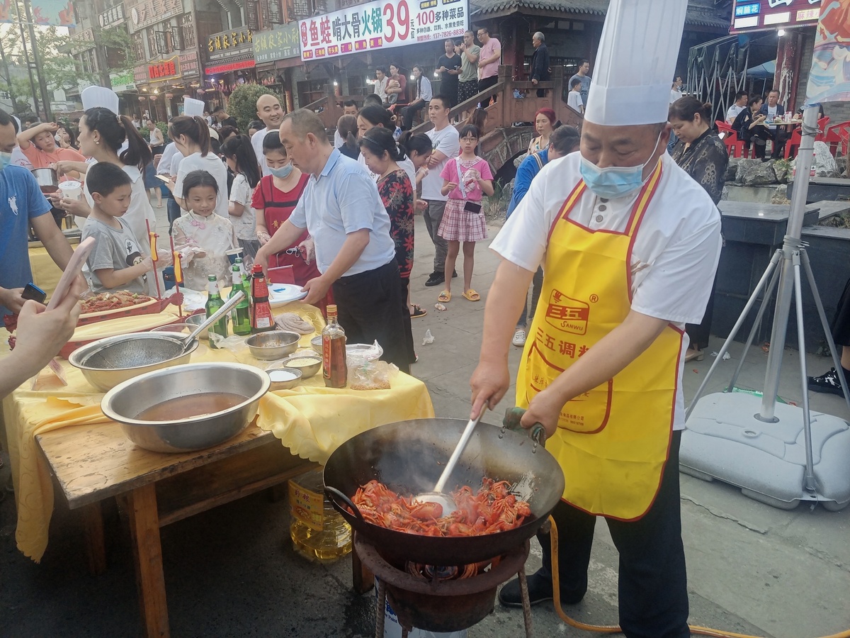 活动现场,高坪镇各大餐饮店的厨师都拿出了看家本领,除了传统的蒜蓉小龙虾、酱爆小龙虾和香辣小龙虾外,柠汁小龙虾和藤椒小龙虾等新口味也不断摆上桌,供大家免费品尝。滚油、下料、爆炒、加汤、勾汁……整条街虾香四溢。