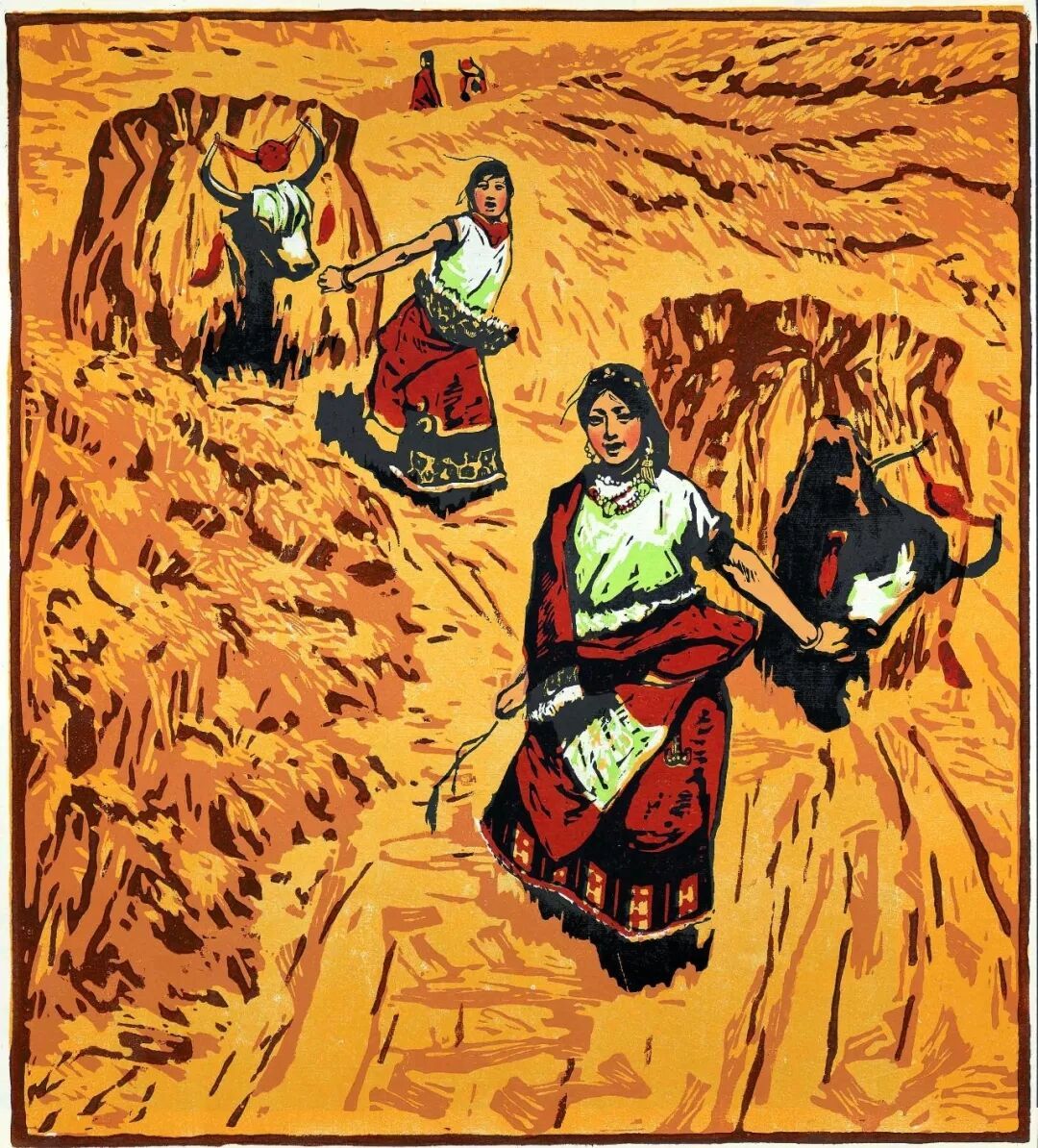 第三部分“初踏黄金路”,以李焕民的名作《初踏黄金路》为核心,展示其手稿及文献资料。上世纪60年代,李焕民在藏区参加秋收,看到藏族妇女牵着驮满青稞的牦牛回家,边走边唱。“我想如果把运粮的路放到历史长河中去思考,从麦田到打麦场不过一里之遥,藏族人民却走了一千年,今天才初次踏上黄金路。”经过反复构思,他最终在画面中保留了两个牵着牦牛的藏族妇女,其中一人昂着头,张着嘴好像在唱歌,另一人把一支袖子搭在肩上,走得十分潇洒、自在。“我希望读者能从画面的金黄色调、麦田的斑斓刀法、人们自信的步伐中感受到藏族人民进入了一个新的时代。”