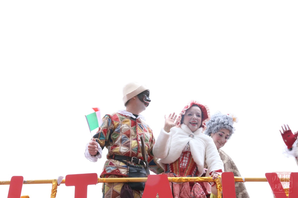 花车巡游路上,一路上来自意大利等国的演员们在大巴上层向泸州市民挥手、打招呼,而市民则纷纷用手机照片、短视频来记录这一难忘的瞬间。