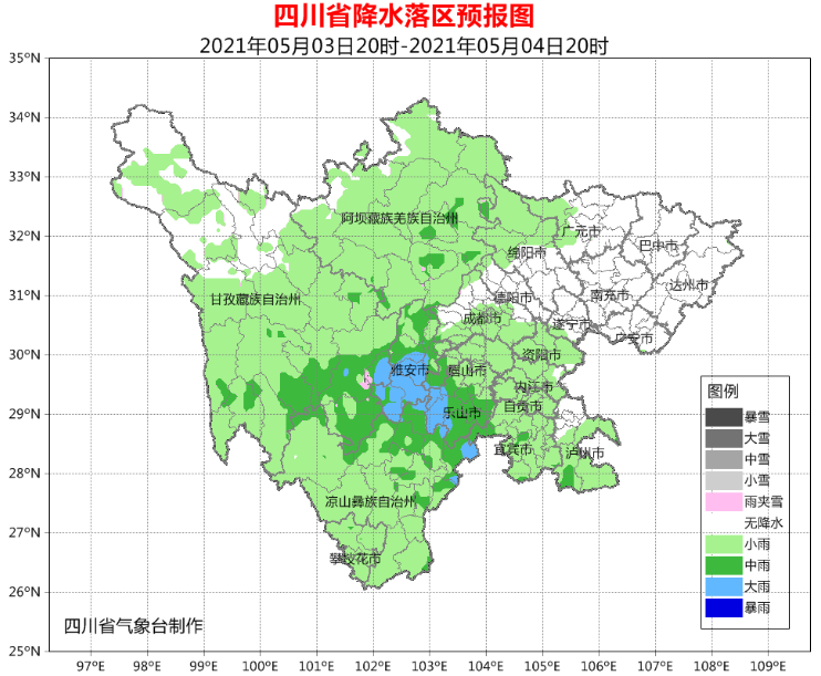 5月4日白天,盆地各市阴天间多云,有3-5级偏北风,其中雅安、眉山、乐山、内江、自贡、宜宾、泸州7市有小雨,局部中雨;川西高原和攀西地区阴天有阵雨。