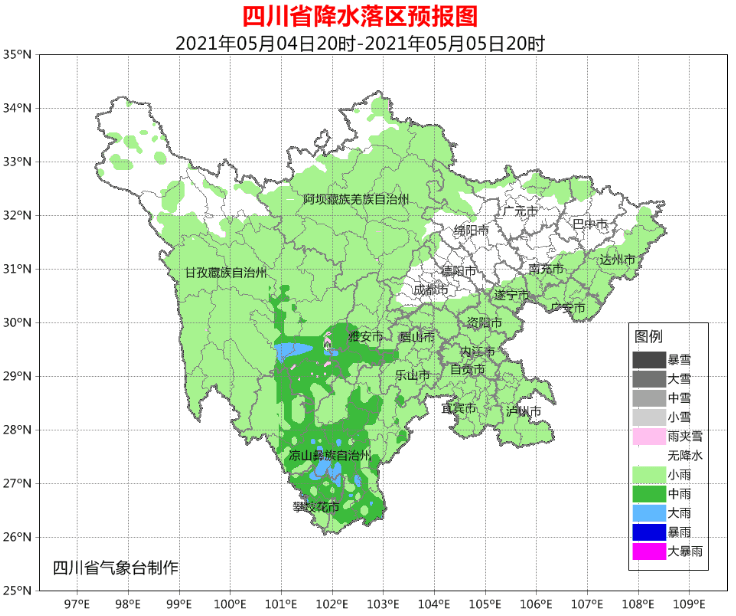 5月4日晚上到5日白天,广元、绵阳、德阳、成都、巴中5市阴天间多云,盆地其余各市阴天有小雨,局部中雨;阿坝州、甘孜州南部和东部以及攀西地区阴天有小雨,局部中雨,川西高原其余地方多云间晴。