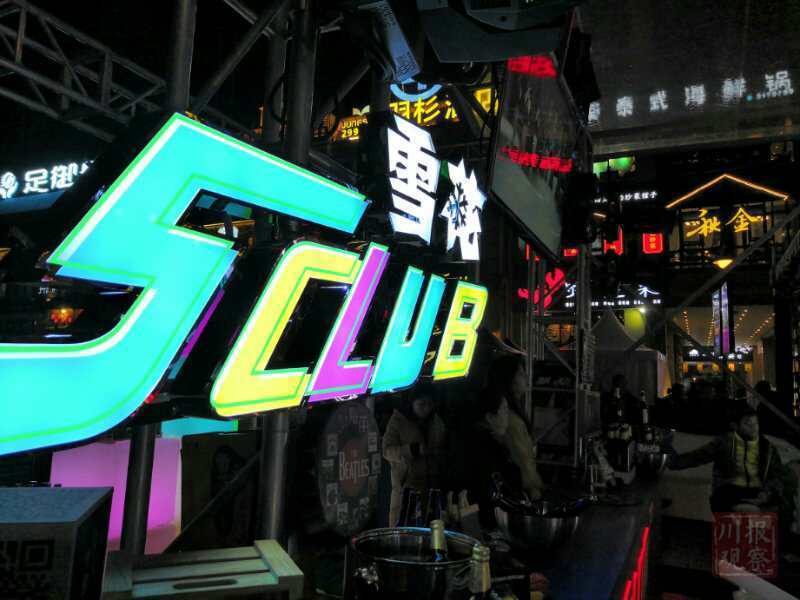 在佳乐金街分会场,一眼扫过去,可以看到这里是雪花啤酒专场。这儿用透明板搭起了一个棚,棚左侧立着一面带着各种灯饰图案和字的主题墙,其中最大的要数“S CLUB”的字样,这正是此次啤酒嘉年华的主题——“S”是super、surprise的意思,代表惊艳的、超越的,当然雪花的英语是“snow”。