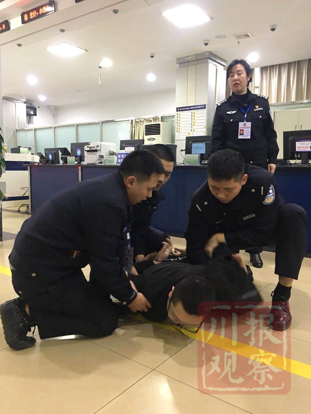 3月21日14时52分许,刘某再次来到遂宁市公安局出入境管理支队办证大厅,民警一眼认出刘某,并给正在后台的民警传递了一个眼神,喊道“有人来补采信息了!”后台的两名民警心领神会,不露声色来到办证大厅,趁刘某不防备扑上去,合力一举制服刘某。