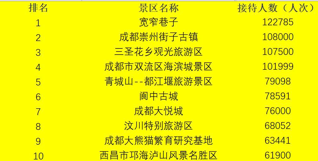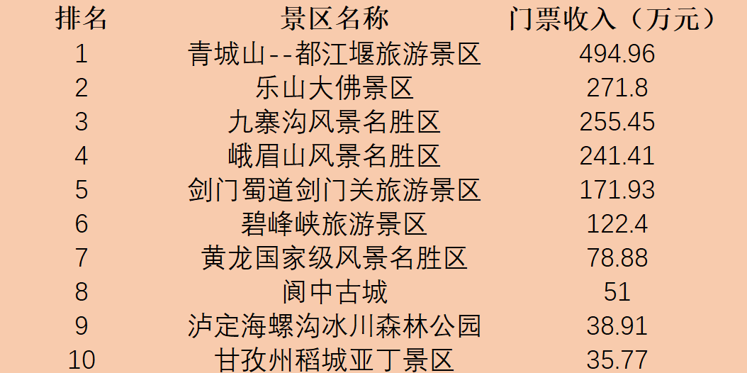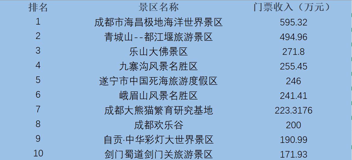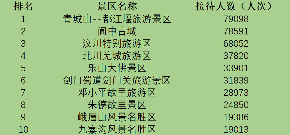 5A级景区中,青城山-都江堰旅游景区仍然热度不减,单日接单游客7.9万人,门票收入494.96万元,两项数据位居第一。乐山大佛、峨眉山、九寨沟等王牌景区仍然稳居前十。