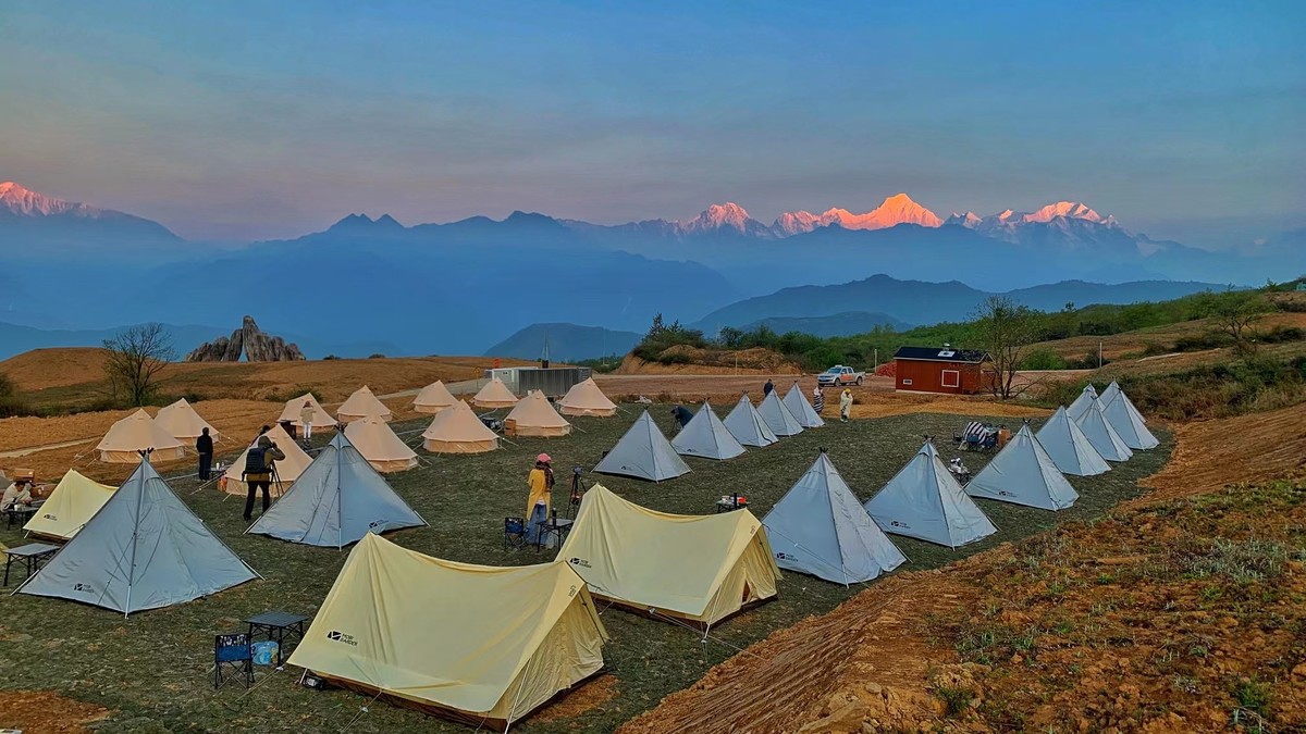 景区严格执行“限流、预约”措施,游客需先通过官方微信公众号预约,刷证进园。五一期间,景区特别推出了帐篷营地体验,满足露营爱好者的需求。在山顶,游客可夜晚与星空对话、早间静观日照金山,与贡嘎荣光“亲密接触”。”