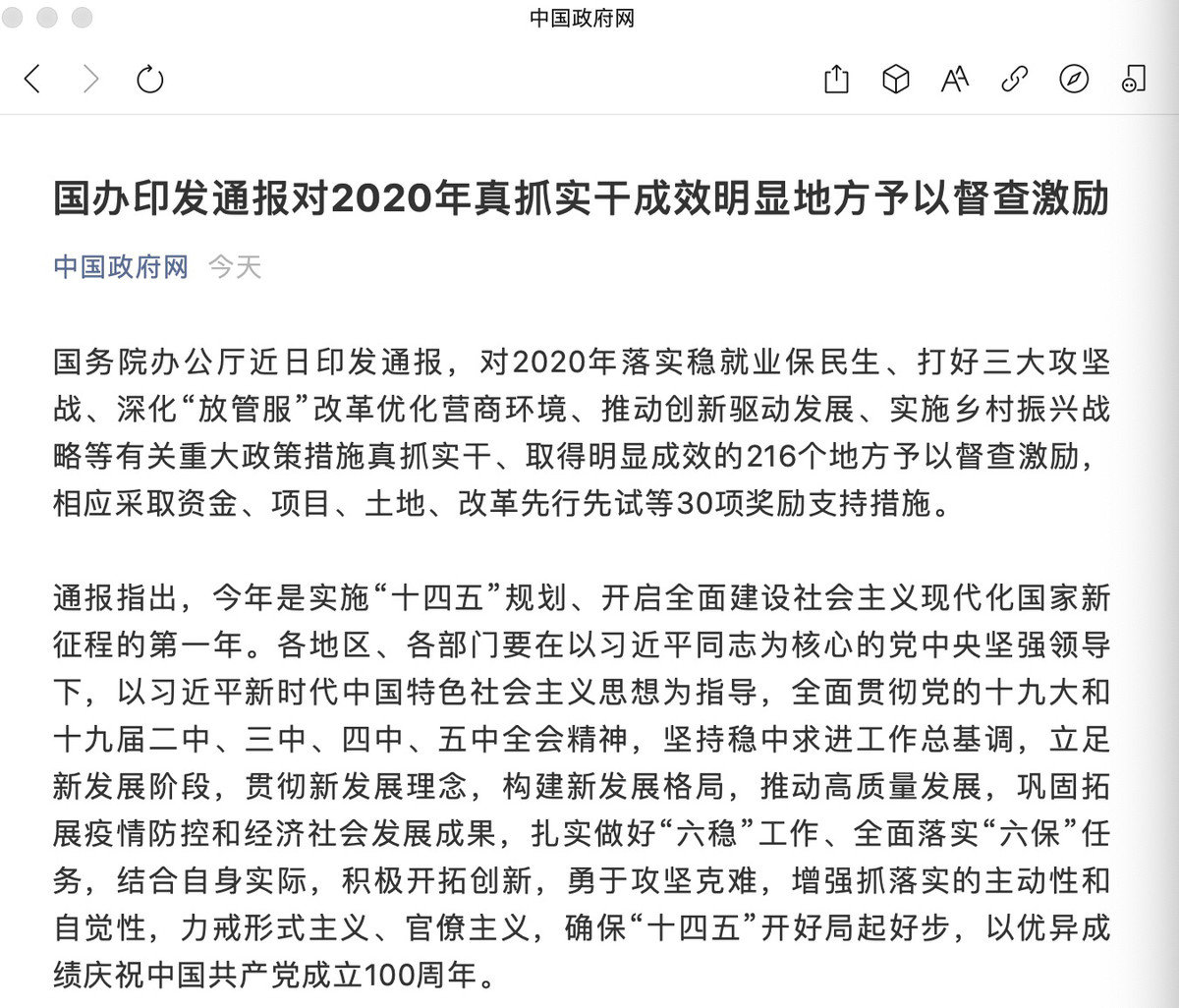 5月7日,中国政府网发布消息,国务院办公厅近日印发通报,对2020年落实稳就业保民生、打好三大攻坚战、深化“放管服”改革优化营商环境、推动创新驱动发展、实施乡村振兴战略等有关重大政策措施真抓实干、取得明显成效的216个地方予以督查激励,相应采取资金、项目、土地、改革先行先试等30项奖励支持措施。四川共获17项督查激励。其中,省本级5项,自贡市、遂宁市2项,雅安市、攀枝花市、泸州市、天府新区、成都市温江区、峨眉山市、北川羌族自治县、三台县、大竹县各1项。